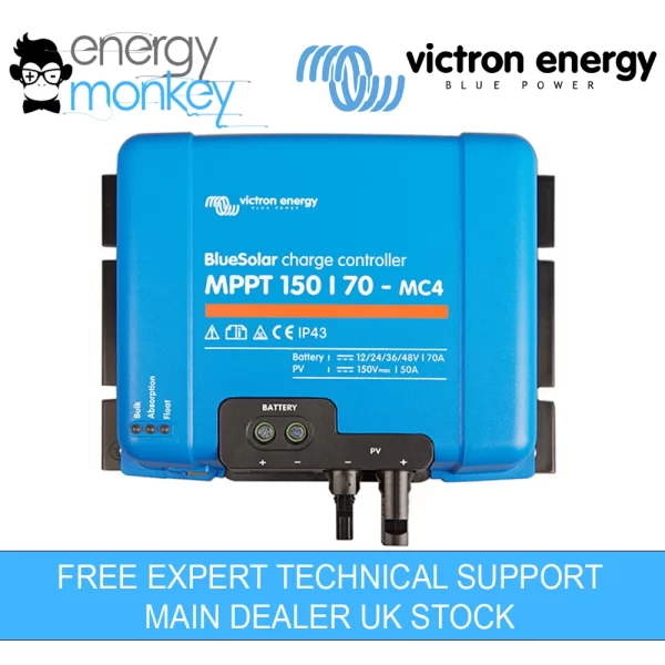 Victron BlueSolar MPPT 150/70-MC4 – Solar charge controller, a solar charger gathers energy from your solar panels, and stores it in your batteries. Using the latest, fastest technology, BlueSolar maximises this energy-harvest, driving it intelligently to achieve full charge in the shortest possible time. BlueSolar maintains battery health, extending its life.