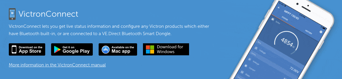 Victron VE.Direct Bluetooth Smart dongle, using the VE.Direct to Bluetooth Smart dongle you can display your BMV or MPPT information on iOS and Android devices, using the VictronConnect app. View information wirelessly such as battery status and solar panel power, plus other useful data.